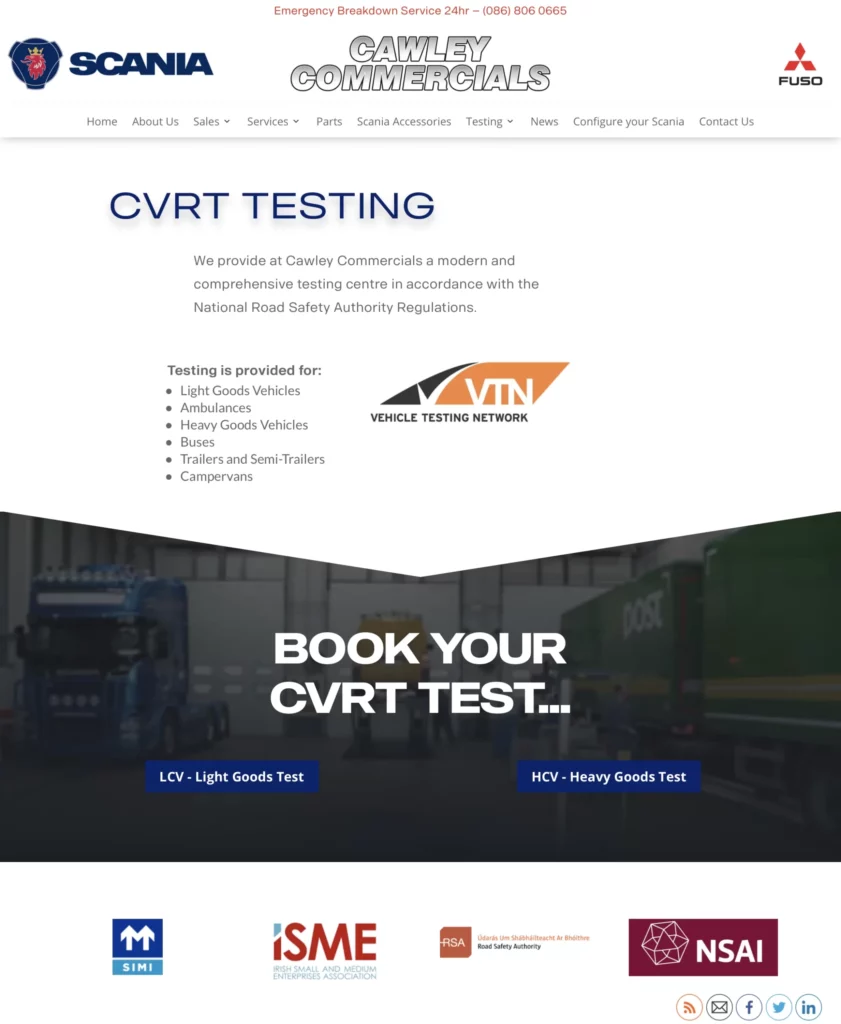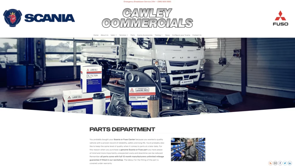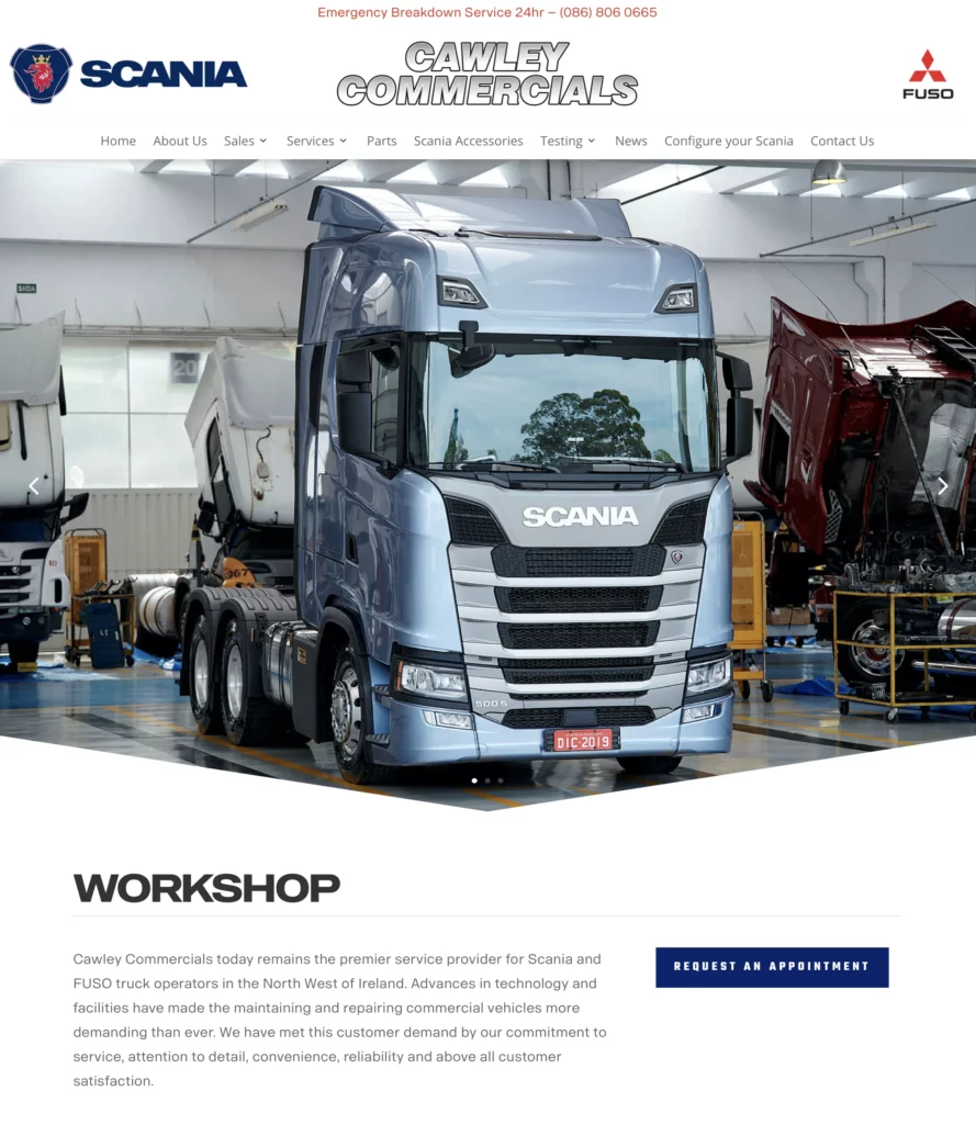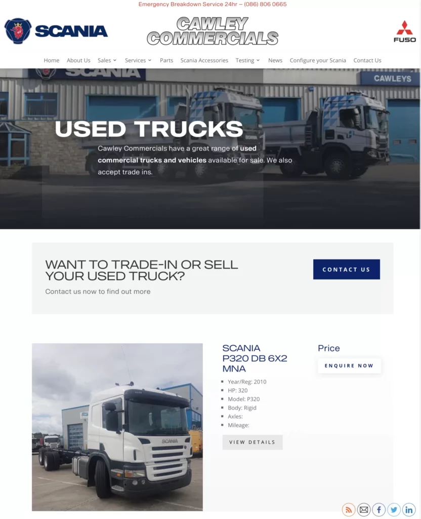 Cawley’s engaged Creation Media to develop a modern engaging brochure website which provided customers with an opportunity to view both new and preowned vehicles, book commercial vehicle testing and servicing and purchase parts. The website was required to maintain the standards and guidelines of the Scania brand and featured a simple Content Management System, (CMS), which allowed Cawley’s to update the stock and other content on the website.